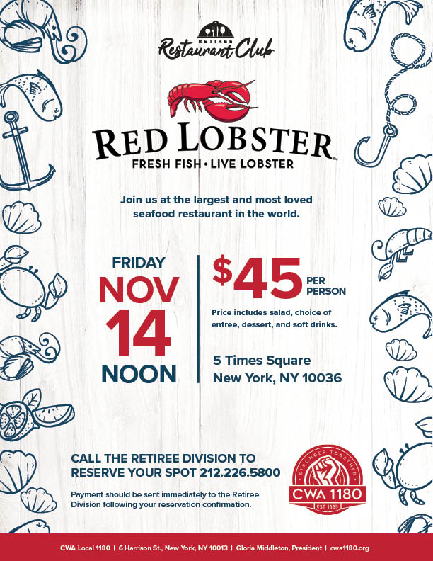 Fri. 11/14 | Restaurant Club at Red Lobster Join in at the largest and most loved seafood restaurant in the world. Enjoy a salad, choice of entree, dessert and soft drinks. $45/person | Red Lobster Call the Retiree Division to reserve your spot today: 212.226.5800 |