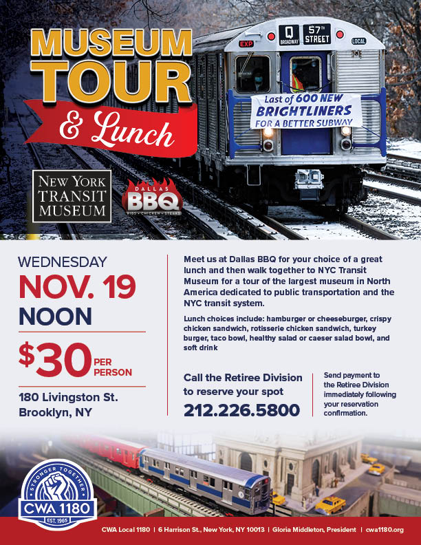 Meet us at Dallas BBQ for your choice of a great lunch and then walk together to NYC Transit Museum for a tour. $30/person | Dallas BBQ Call the Retiree Division to reserve your spot today: 212.226.5800 | |