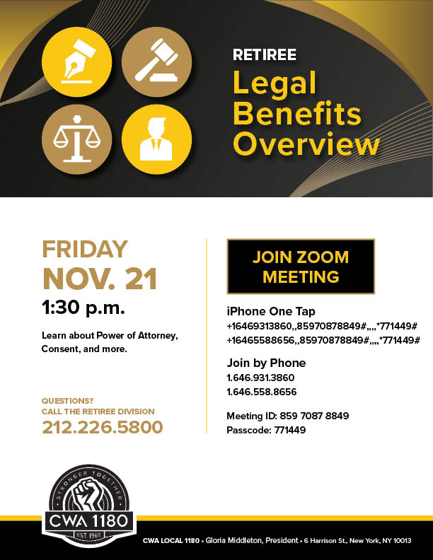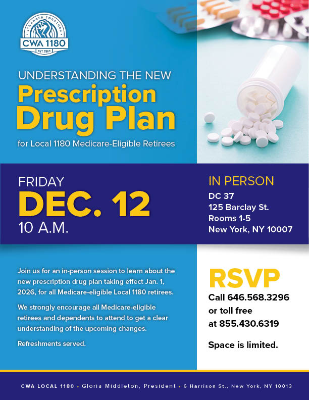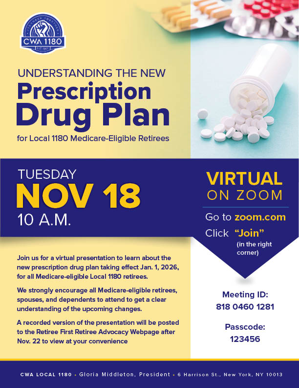 | Tues. 11/18 | Prescription Drug Plan Overview Join us for a virtual presentation to learn about the new prescription drug plan taking effect Jan. 1, 2026, for all Medicare-eligible Local 1180 retirees. | Go to zoom.com Meeting ID: 818 0460 1281 |