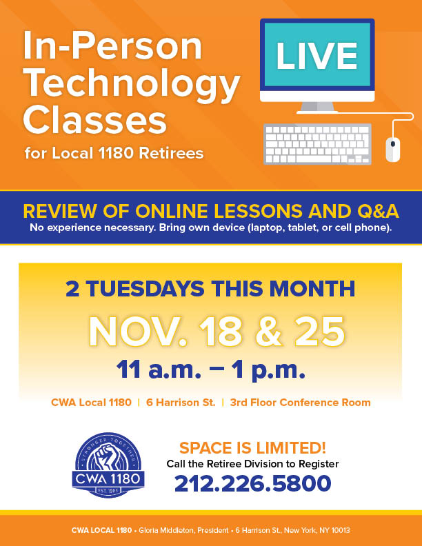 | Tues. 11/25 | IN-PERSON Review of Online Lessons / Q&A | 6 Harrison St. Call the Retiree Division to reserve your spot today: 212.226.5800 |